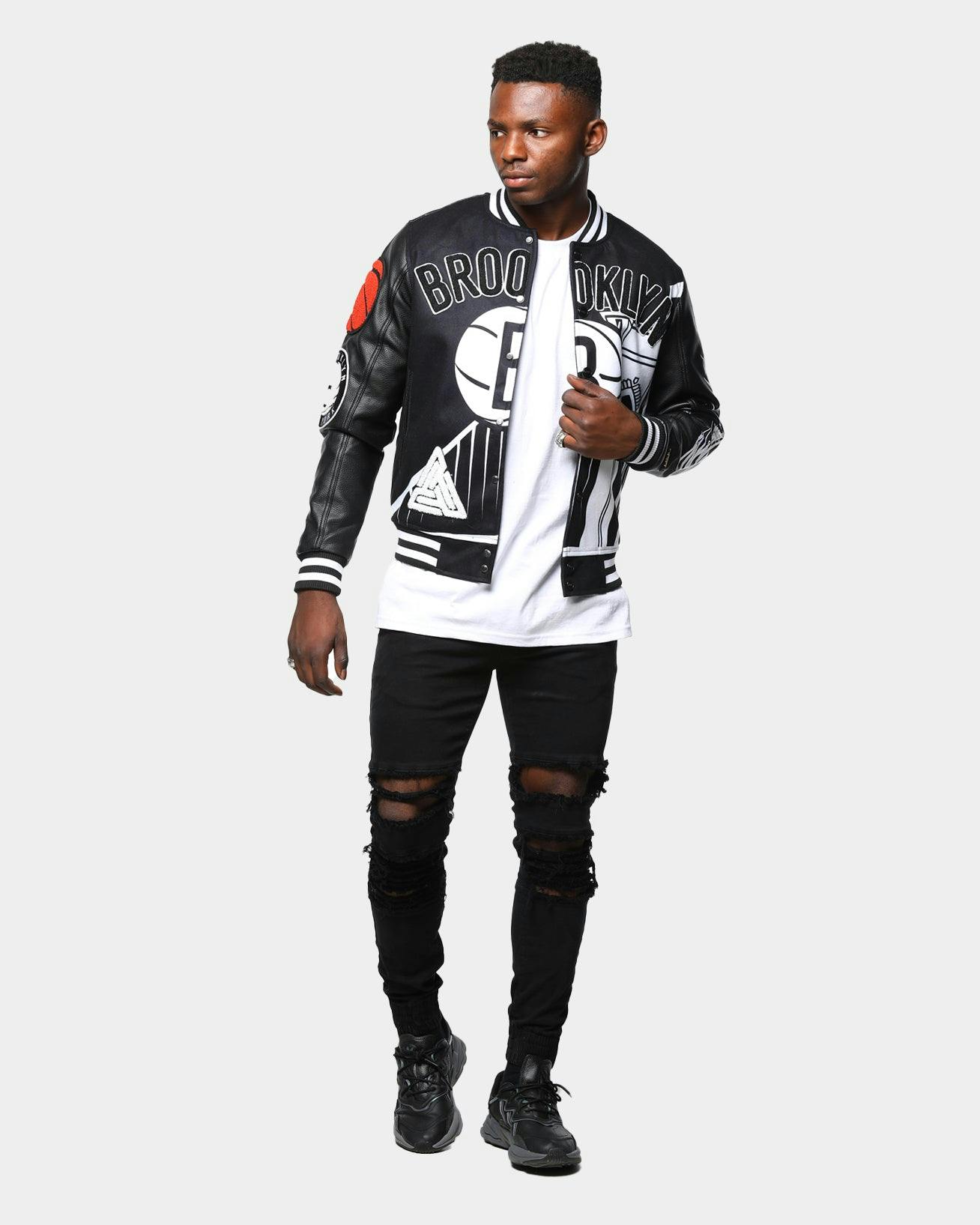 Men S Black Pyramid Brooklyn Nets Logo Varsity Jacket Black Culture Kings Us